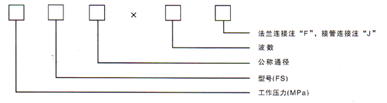 表示:工作壓力為0.6MPa,通徑DN=100mm,波數為20,法蘭連接的復式波紋補償器。