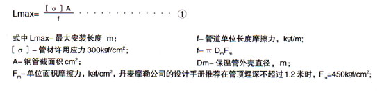 式中E-鋼管彈性模理,kgf/cm2;α-鋼管的線膨脹系數(shù),取0.0133mm/m℃;△t-管道溫差;A、f-同公式①;L-兩固定點之間的距離(_安裝長度)m。 在實際工作中,直埋管道的熱伸長量,采用丹麥摩勒公司的簡化算法。