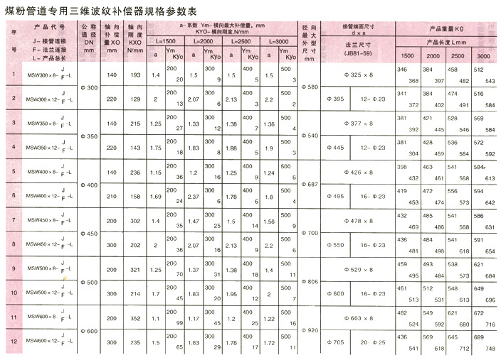煤粉管道專用三維波紋補償器規格參數表
